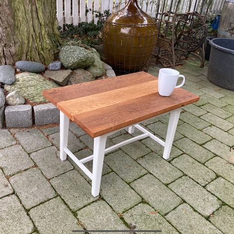 Hvidt sidebord i træ med kvadratisk bordplade. Bordet har en kraftig top med markeret midterfelt og dekorative buede ben. Egnet som sidebord ved sofa, lænestol eller seng. Overfladen fremstår med synlige brugsspor og patina. Velegnet til indendørs brug i stue, soveværelse eller entré.