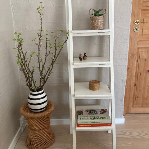Funktionel stigereol fra Biva i eg struktur med hvide hylder og opbevaringskasse inkl. skuffe.