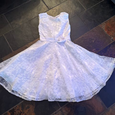 Kjole, Festkjole, str. 116, Smuk A-facon kjole i hvid med blå strib og et lyserødt sløjfe-bæltestykke.