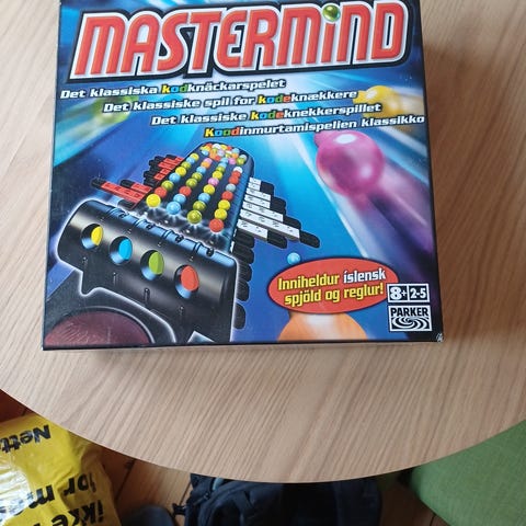 Master Mind brætspil med spilleplade og farvede plastbrikker. Spillet består af en rektangulær spilleplade med huller til kode og gæt samt et rum til opbevaring af brikkerne. Medfølgende brikker i flere farver samt små sorte og hvide markørbrikker til angivelse af rigtige farver og placeringer. Strategispil for to spillere, hvor den ene laver en skjult farvekode, og den anden forsøger at gætte koden på et begrænset antal forsøg.