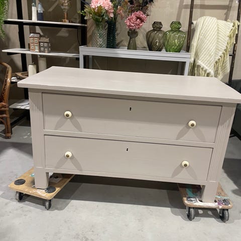 Lille skænk i fin stand. Den er hvid og mørkebrun og inde bag skabslågen er der to hylder. Den har ingen ridser, fejl eller skader.