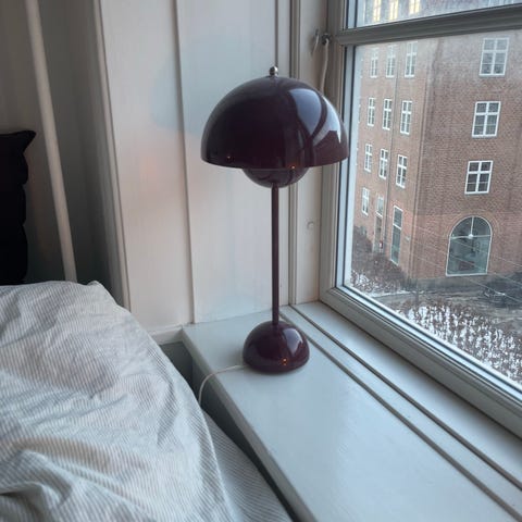 &Tradition Verner Panton flowerpot VP3 bordlampe i en flot mørkegrøn farve. Klassisk kuppelformet skærm og slank stander på rund fod. Egnet som bord- eller sengelampe i stue, soveværelse eller kontor.