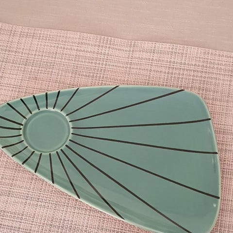 I burgunderfarve med guld mønster og guld kant. 27 cm I diameter. Samlerobjekt