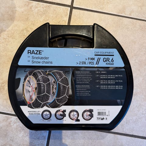 Raze GR.9 snekæder til bil. Sættet indeholder 2 stk. snekæder, der passer til dæk med mere end 9 mm frigang. Leveres i plastkuffert med monteringsvejledning illustreret på emballagen. Velegnet som ekstraudstyr til bilkørsel på sne- og isglatte veje, hvor der kræves snekæder på dækkene.