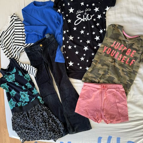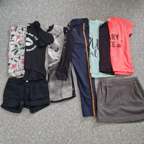Pakke med diverse pigetøj i str. 134 (8-9 år), nogle dele er mærket str. 134-140 (8-10 år). Tøjet er brugt, men generelt i ok stand uden defekter. Fra røgfrit hjem. Vasket uden brug af parfume/skyllemiddel og tørretumbler.