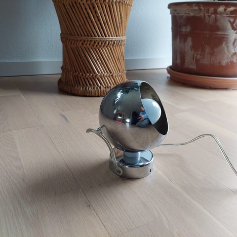 Frandsen Ball væglampe i mat grå farve. Lampen har en rund skærm monteret på en rund vægplade med buet arm. Den er velegnet som belysning ved sofa, seng eller læsekrog og giver et nedadrettet lys. Designet er enkelt og funktionelt, og lampen tilsluttes med ledning fra skærmen ned langs væggen.