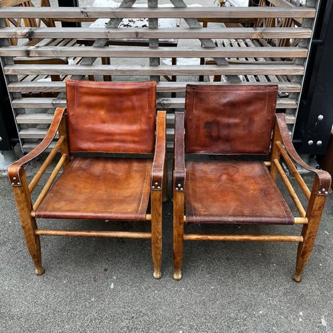 Sælger Kaare Klint læder safaristol. Trænger til en kærlig hånd, fx behov for ny pude (se billeder), og kunne nok godt bruge nogle nye remme. Desuden er den gået op nedenunder, så det skal også fixes før den kan tages i brug.
