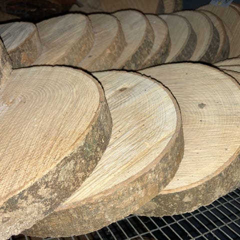 6 store flotte birketræ skiver, ca størrelse 35-40 cm I diameter og omkring 7-8 cm I højden.