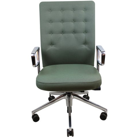 Flotte Vitra ID Trim kontorstol i limegrønt møbelstof, armlæn og fodkryds i poleret aluminium med bløde hjul.