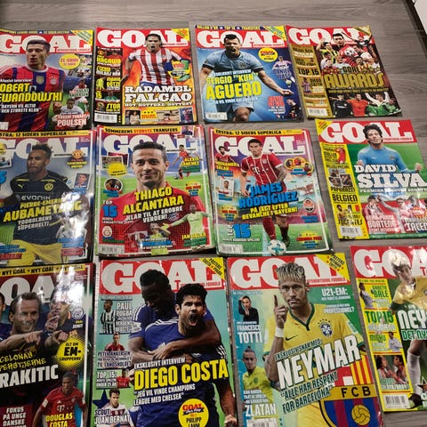 Goal fodboldmagasin bladlot. Samling af flere numre af fodboldmagasinet Goal med forskellige forsider med kendte fodboldspillere. Magasinerne indeholder artikler, interviews, statistik, plakater og andet indhold relateret til international fodbold. Velegnet til samlere eller fodboldinteresserede, der ønsker ældre udgaver af bladet samlet i én lot.