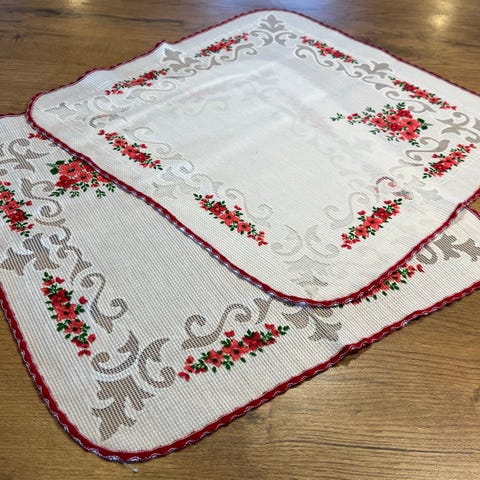 Ægte vintage håndarbejde. Hæklet/broderet. Brugt, så der kan forekomme kaffepletter og mindre skader, huller og slid, så se venligst alle billeder for stand. Kan bruges som den er, men kan måske også bruges til noget kreativt krea projekt?