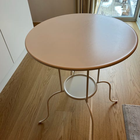 IKEA sidebord med rundt bordplade i hvid. Stel i hvidt metaltråd med gitterdesign. Bordet har en højde på ca. 41 cm og en diameter på ca. 46 cm, egnet som sofabord, sengebord eller lille aflastningsbord i stue, soveværelse eller entré. Designet af Alfred Homann.