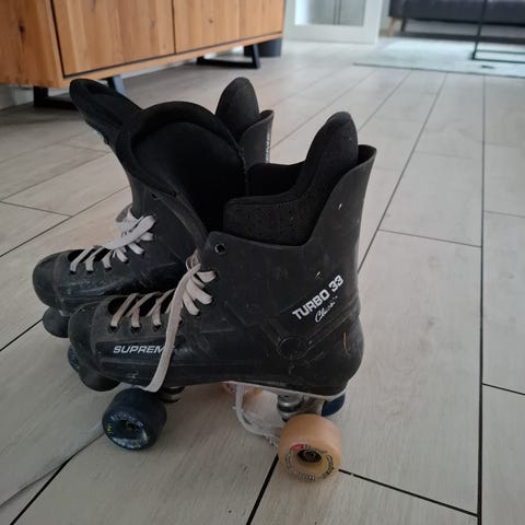 Turbo 33 Classic rulleskøjter i størrelse 37. Klassiske( små ridser i front ellers nye.)side-by-side rulleskøjter med sorte støvler og snørelukning. Hjulene er af modellen Nuke, egnet til rulleskøjteløb på glatte underlag. Velegnet til fritidsbrug og træning for personer, der passer størrelse 37.( medfølger pose med hånd/ albue/ knæ beskyttelse)