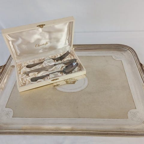 Christofle Ocena Bleu sæt på 4 ovale tallerkener fra luksuskollektionen Ocena Bleu fra den velrenommerede franske manufaktur Christofle. Håndmalede 24 karat gildede detaljer. Tilstand: meget god, ingen synlige mangler eller slitage på gildningen. Micro Gold-teknologi gør det muligt at bruge forgyldt porcelæn i mikrobølgeovn.