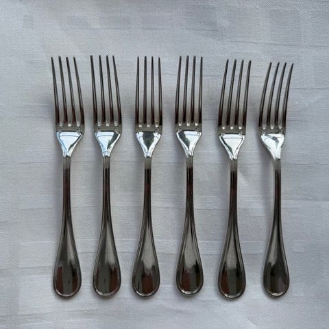 Beskrivelse: Et flot sæt bestikdele i modellen Spatours, bestående af seks fiskegafler, en suppeske, en jus-ske og en serveringsgaffel og serveringsske.