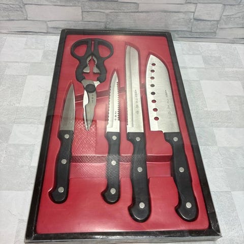 Selvom knivene i sig selv ser ud til at være ubrugte, betragtes denne vare som en opbevaret vare snarere end helt ny. Et praktisk og samlervenligt knivsæt designet af en kok, ideelt til både brug og fremvisning.