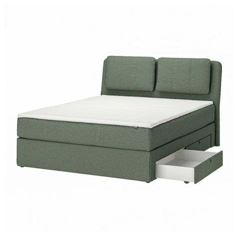 Kontinentalseng i grå tekstil med opbevaring under. Sengen består af to senge placeret side om side, som tilsammen danner en dobbeltseng. Sengen står på ben.
