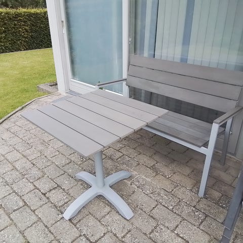 Havebord med integrerede bænke i træ i sort farve. Klassisk picnicbord, velegnet til udendørs brug i have, på terrasse eller i gårdmiljø. Bordet har siddepladser på begge sider og står på et stabilt understel. Egnet til spisning, ophold og andre aktiviteter udendørs.
