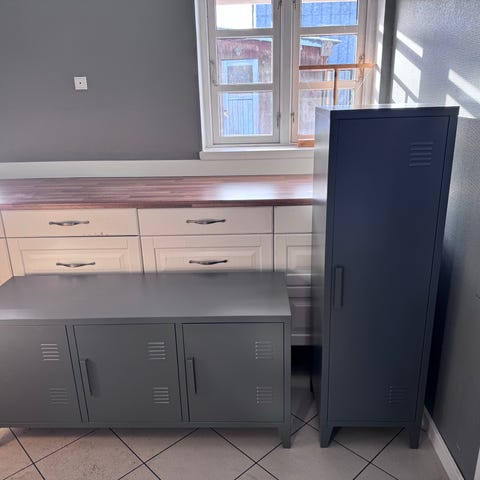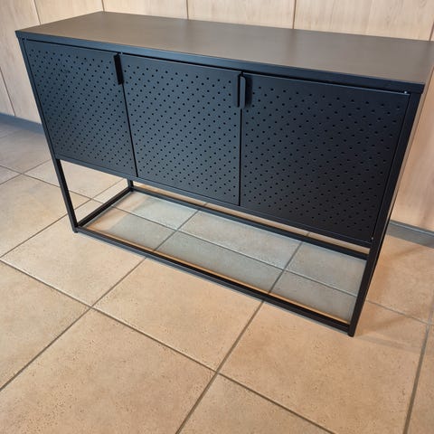 Sort metal skænk med 3 låger og en hylde bag hver låge
