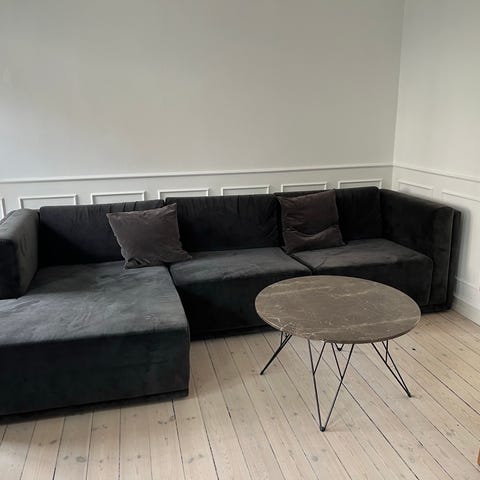 Flot hjørnesofa fra Sofacompany i sennepsgul velour. Sælges for min mor og kan afhentes i Skodsborg.