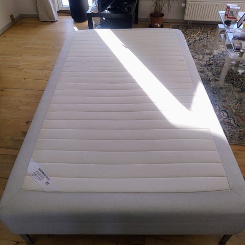 IKEA Sultan Skaland madras i grå betræk. Madrassen er en boksmadras i målene: 120x200cm. Der medfølger metalben på 20cm så højden er i alt 43cm.
