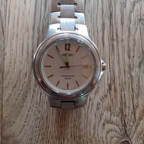 Super fedt Seiko Presage med blå urskive i virkelig god stand. Jeg har skiftet urskiven og viserne for sjov (til det med de orange timemarkører, se de første billeder), men original skive og visere følger også med ved siden af. Det samme gør den originale stållænke.