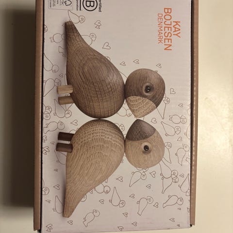 Kay Bojesen sangfugl dekorationsfigurer i træ. Liv og Lykke i æske. Sættet består af to fugle i grønne nuancer med lyse hoveder og næb. Figurerne er udført i malet træ og kan anvendes som dekoration i stue, børneværelse eller andre rum i hjemmet. Klassisk design fra Kay Bojesen Denmark med fokus på enkle former og bløde linjer. Den sendes ikke, prisen er fast og kontanter foretrækkes.