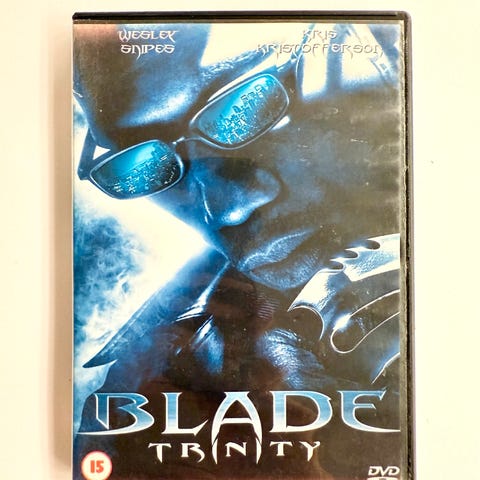 Blade Trinity dvd i unrated version. Forsiden viser filmens titel og hovedpersoner. Aldersgrænse 15 år ifølge omslaget. Standard dvd-udgave egnet til afspilning på dvd-afspillere, der understøtter regionen angivet på coveret.