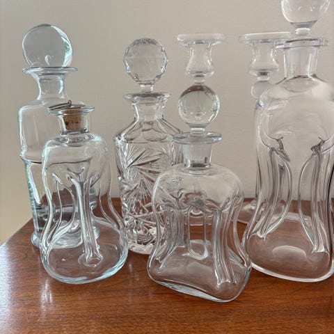 5 stk. store glaskarafler nogen i krystal. Tror det er dem alle. Nogen fra Holmegård.