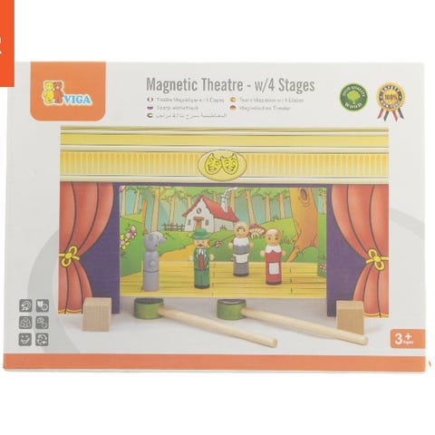 Dette magnetiske teater er designet til interaktiv leg og indeholder 4 forskellige eventyrscener: Rødhætte, Askepot, Pinocchio og De Tre Små Grise. Sættet indeholder 15 træfigurer, 2 træpinde med magneter, 4 papkulisser og en scene. Alle komponenter er flade og passer i en kasse, der måler 33,5x25 cm. Produktemballagen viser billeder af de forskellige scener og komponenter inkluderet.