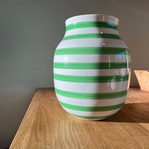 Denne vase er lavet af keramik og har en glat overflade. Den måler 12,5 cm i højden og har en enkel, cylindrisk form. Vasen har en enkel grøn farvetone og er perfekt til små blomsterarrangementer eller som dekoration alene. Bunden af vasen har tydelig Kähler brandmarkering.
