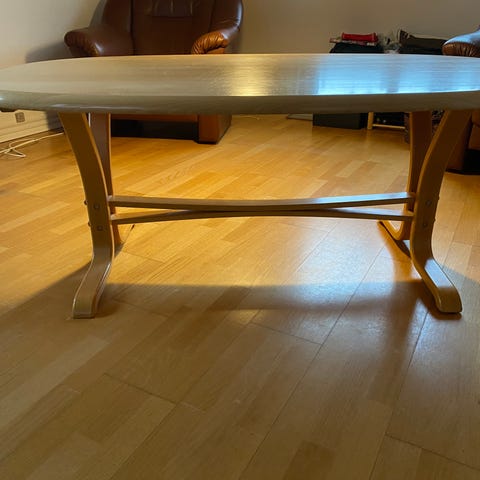 9 stk. Rektangulært spisebord fra Østergaard i træ med gennemgående åretegning i bordpladen. Bordet har søjleben i træ med T-formet fod, som giver god benplads langs siderne. Egnet som spisebord eller mødebord i køkken, spisestue eller kontor. Overfladen fremstår med varm træfarve og glat finish.