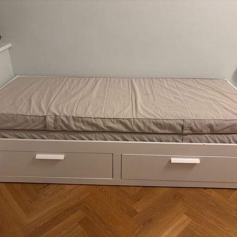 IKEA udtræksseng i hvid. Sengen har integrerede opbevaringsskuffer under liggefladen, som kan bruges til sengetøj, puder eller legetøj. Modellen fungerer både som enkeltseng og kan udtrækkes til en større soveplads. Velegnet til børneværelse eller mindre rum, hvor der er behov for ekstra opbevaring og fleksibel soveplads.