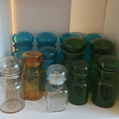 Apoteker glas med matpudset låg, som sikre tæt lukning. Brugt til piller, væsker og lignende i tidernes morgen