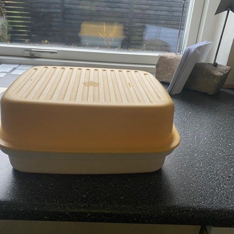 Tupperware brødbeholder i plast med låg. Farven er gul, hvilket gør den let at genkende i køkkenet. Beholderen er velegnet til opbevaring af brød og holder det frisk i længere tid. Praktisk til både hjemmebrug og picnic.