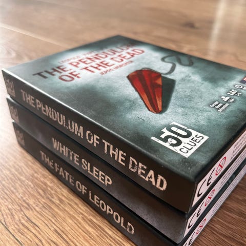 50 Clues De Dødes Pendul brætspil. Escape room-lignende spil i boks, hvor spillerne skal løse gåder og følge spor for at komme videre i historien. Spillet er velegnet til voksne og større børn og kan spilles i mindre grupper. Indeholder alle kort.
