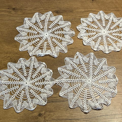 Hæklede mellemlægsservietter i rund form og hvid farve. Sættet består af flere forskellige mønstrede servietter i fint hæklet tekstil, velegnet som dekoration på borde, kommoder eller under vaser og skåle. Materialet fremstår som klassisk hæklearbejde i lys nuance, som kan bruges samlet eller enkeltvis alt efter behov.