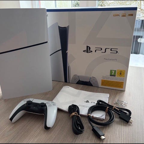 Sony Playstation 5 konsol i hvid. Konsollen har lodret design med integreret diskdrev på fronten. Egnet til gaming, streaming og afspilning af kompatible spil og medier til Playstation 5-platformen. Velegnet til brug med HDMI-kompatible tv og skærme samt trådløse eller kablede controllere, der understøtter Playstation 5.