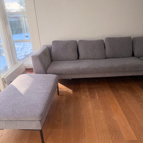 Sofaen er brugt, men i god stand uden huller eller slidmærker. Den er rengjort, men med en smule damp vil den stå endnu flottere - det kan også få betrækket til at trække sig lidt sammen på chaiselongen, hvor det har udvidet sig lidt.