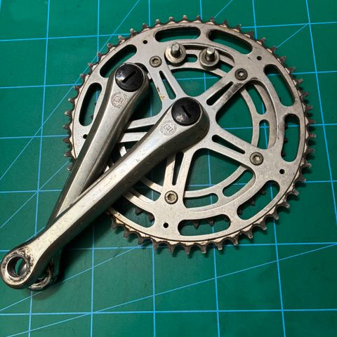 Cykel kranksæt og geardele i sølvfarvet metal. Sættet omfatter blandt andet kranksæt med klinge, bagskifter, forskifter, bremsekalibre, pedalarme, lejer og småbeslag. De enkelte dele kan anvendes som reservedele eller til opbygning og reparation af cykel med matchende komponentstandard. Velegnet til cykelentusiast, der har brug for løse dele til ældre eller klassisk cykelopsætning.