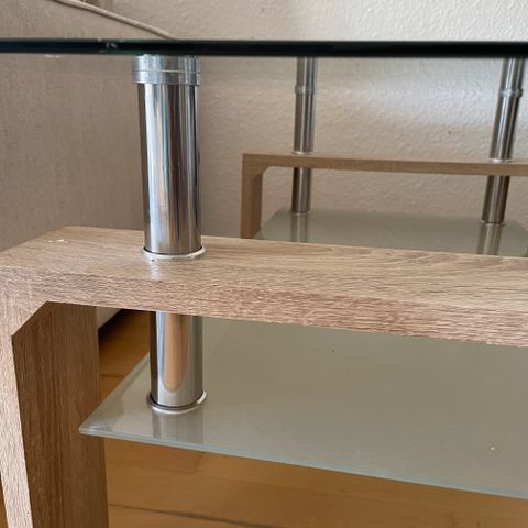 Fint sofa bord med plads til pynt og blade/bøger på hylden