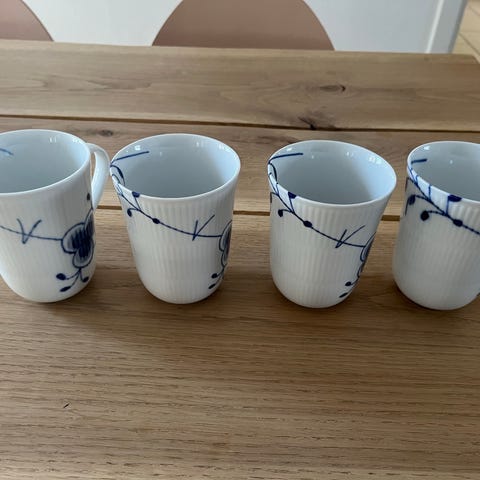 Royal Copenhagen krus i hvid porcelæn blå muselmalet. 6 stk. 36 cl