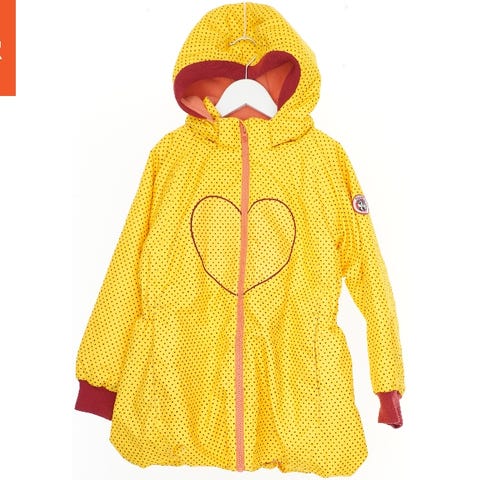 Denne børne vinterjakke er rød og har en hætte med en aftagelig pelskrave. Jakken har en stor forlomme med knaplukning på forsiden og reflekterende striber. På bagsiden er et lille tryk med et racoon-motiv placeret nederst.