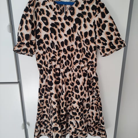 Kjole med leopardmønster. Den har lange ærmer og en krave med flæsedetaljer. Lukkes med knapper foran og har manchetter med sorte kantdetaljer.