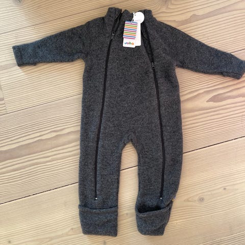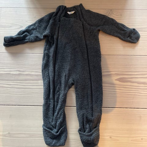 En grå heldragt med lange ærmer og ben, lavet af en uldblanding, hvilket giver en blød og varm struktur. Dragten har en frontlynlås, der gør det nemt at tage den af og på. Designet er komfortabelt og praktisk til kolde dage.