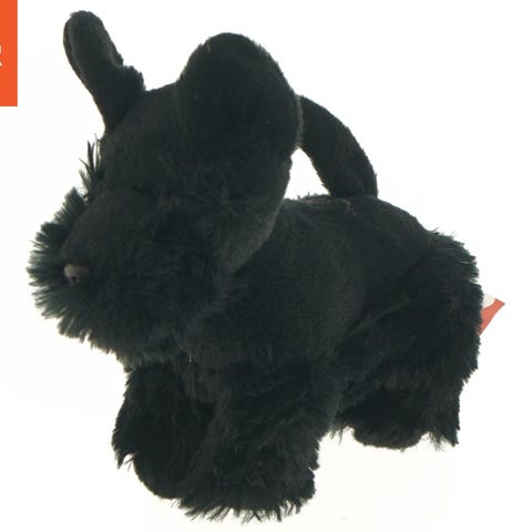 Dette er en interaktiv plys hund med farverige detaljer. Den har blå ører og en farverig skjorte med bogstaver. Hunden er designet til leg og læring, med mærker der viser forskellige kropsdele. Den er ideel til børn, og dens højde er 36 cm.