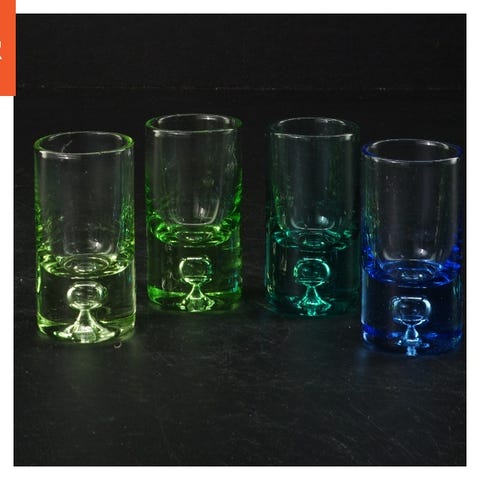 Sættet består af fire identiske glas med tryk. Glassene er gennemsigtige med et design på siden. To af glassene har et billede med teksten 'Bottom'. De er velegnede til servering af drikkevarer og har dimensionerne 5x6 cm.