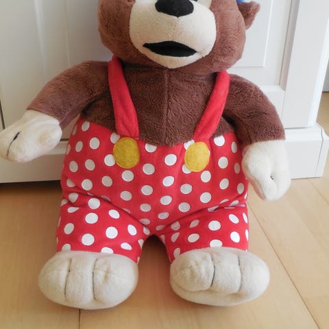 Dette er et bamseformet tøjdyr iført en blå hue og et par røde selerbukser med hvide prikker. Tøjet har gule knapper til pynt, og bjørnen har et venligt ansigt med store øjne og et smil. Tøjdyrens størrelse er 42x22 cm.