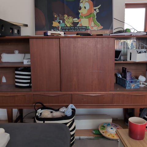 Gammel skænk i teak træ der er blevet hvidmalet gives væk mod at den hentes senest onsdag d. 18. Februar i Granvænget 13.