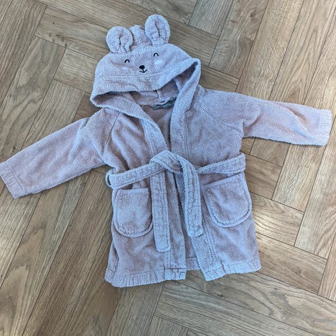 En lyserød badekåbe til børn med hætte formet som et bjørneansigt. Badekåben har lange ærmer og et bindebælte til at stramme om taljen. Materialet ser blødt og behageligt ud, velegnet til at holde varmen efter badet.